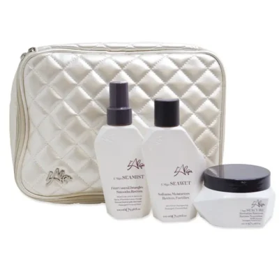 L’Alga plaukų priežiūros rinkinį „Seazone Beauty Bag“ sudaro:atstatomasis šampūnas plaukams L’Alga „Seawet Shampoo“, 100 ml, atstatomoji kaukė plaukams L’Alga „Seacure Masque“, 100 ml ir losjonas – dulksna plaukams L’Alga „Seamist Leave-In Spray“, 100 ml.